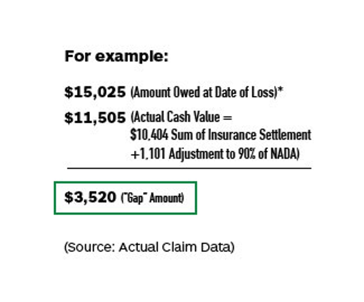 The Amount Owed does not include missed payments, payment extensions, deferred payments, accrued interest, late fees, disposition fees, penalty fees, early termination fees or finance charges incurred after the date of loss. Also, if the insurance company valuation used to calculate the Actual Cash Value is less than 90% of the NADA value of your vehicle, the NADA value will be used in determining the "gap" amount waived (which means a smaller amount may be waived).